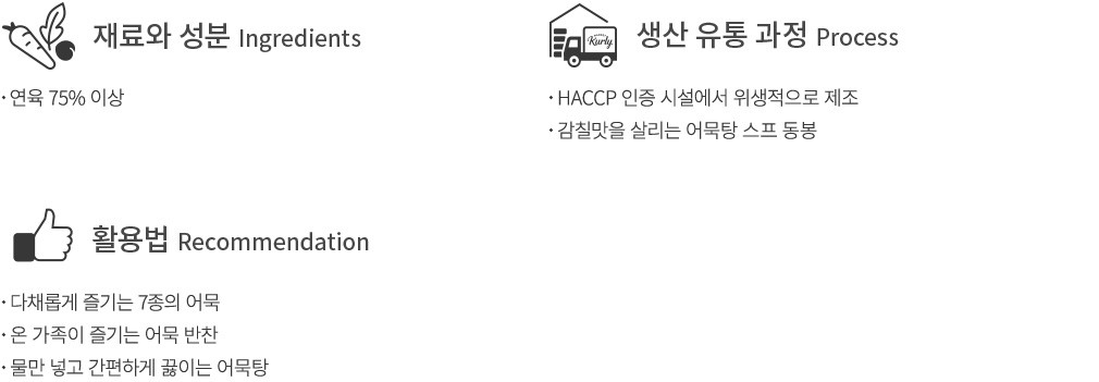 -7가지 모듬어묵 : 밀, 오징어, 대두, 새우, 게, 쇠고기, 우유, 토마토 함유 *본 제품은 메밀, 돼지고기, 닭고기, 계란, 호두, 이산화황, 복숭아, 조개류(굴, 전복, 홍합 포함)를 사용한 제품과 같은 제조시설에서 제조하고 있습니다. -어묵탕 스프 : 우유, 대두, 밀 함유 *본 제품은 계란, 메밀, 새우, 오징어, 땅콩, 고등어, 돼지고기, 게, 복숭아, 토마토, 아황산류, 호두, 쇠고기, 닭고기, 조개류(굴, 전복, 홍합 포함), 잣을 사용한 제품과 같은 제조시설에서 제조하고 있습니다.