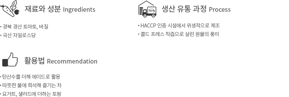 콜드 프레스 착즙 공법으로 원물 본연의 풍미를 살린 프루티프루티의 수제청을 만나보세요. 지금 만나볼 토마토바질수제청은 경북 경산에서 수확한 토마토에 향긋한 바질을 더해 산뜻한 맛을 자랑해요. 국산 자일로스당으로 은은한 단맛을 더한 것은 물론, 깨끗이 손질한 과육을 더해 진한 맛과 풍성한 식감까지 놓치지 않았답니다. 따뜻한 물에 타서 차로 즐기는 것은 물론, 탄산수에 희석해 에이드를 만들어 보세요. 요거트나 샐러드에 더하는 포인트 토핑으로도 제격일 거예요.