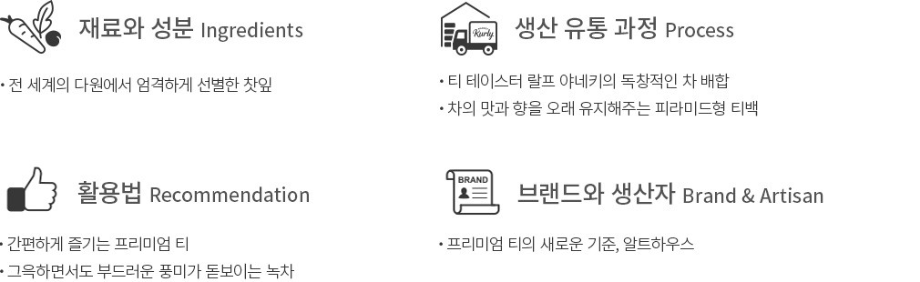 알트하우스는 '오래된(ALT) 집(HAUS)'이라는 뜻을 지녔습니다. 오랜 시간 동안 한자리를 지킨 집처럼, 알트하우스는 아늑하고 편안한 느낌을 주며 오감을 만족시키는 블렌딩을 추구하죠. 알트하우스의 차는 현재 유럽 최고의 티 테이스터이자 마스터로 손꼽히는 랄프 야네키(Ralf Janecki)의 손끝에서 탄생합니다. 세계 곳곳의 다원에서 차를 공수하고, 맛을 연구하며, 독창적인 블렌딩으로 마시는 즐거움을 선사해요. 작은 티백 속에 담긴 품격을 컬리에서 만나보세요.