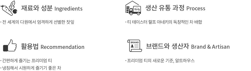 알트하우스는 '오래된(ALT) 집(HAUS)'이라는 뜻을 지녔습니다. 오랜 시간 동안 한자리를 지킨 집처럼, 알트하우스는 아늑하고 편안한 느낌을 주며 오감을 만족시키는 블렌딩을 추구하죠. 알트하우스의 차는 현재 유럽 최고의 티 테이스터이자 마스터로 손꼽히는 랄프 야네키(Ralf Janecki)의 손끝에서 탄생합니다. 세계 곳곳의 다원에서 차를 공수하고, 맛을 연구하며, 독창적인 블렌딩으로 마시는 즐거움을 선사해요. 작은 티백 속에 담긴 품격을 컬리에서 만나보세요.