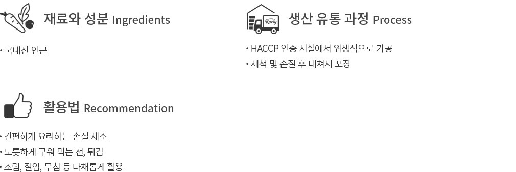 구매 전 참고사항 ・ 연근의 일부분이 보랏빛을 띄는 경우가 있어요. 이는 연근의 탄닌 성분으로 인한 자연스러운 현상이니 안심하고 드세요.