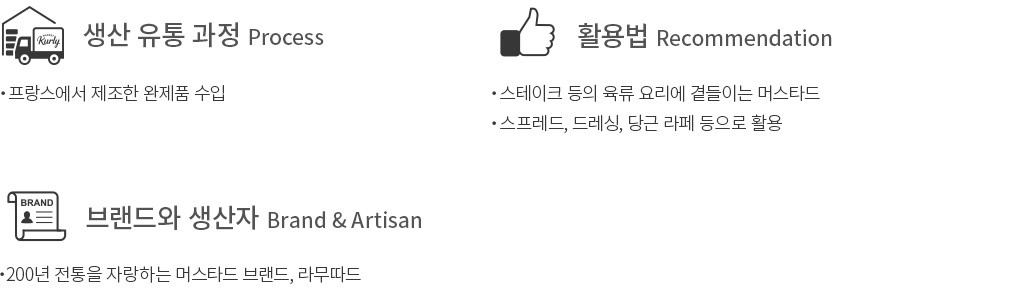 200년 이상의 전통을 자랑하는 머스타드 브랜드, 라무따드를 소개할게요. 지금 만나볼 홀그레인 머스타드는 겨자씨와 겨자씨 껍질을 30% 이상 함유해 풍성한 식감을 자랑해요. 톡톡 터지는 알싸한 풍미와 은은한 매콤함이 돋보인답니다. 스테이크에 곁들이는 것은 물론, 당근 라페를 만들 때 활용하기 좋을 거예요.