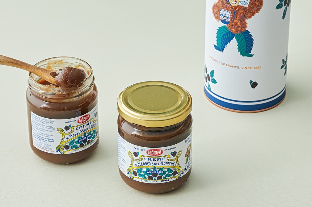 빈티지한 감성이 담긴 패키지로 많은 사랑을 받고 있는 크렘드마롱의 비쥬 밤잼 선물세트를 소개합니다. 130년을 밤에만 집중해 온 클레망 포지에 사의 브랜드인 만큼 고소한 밤 향을 그대로 담아냈어요. 밤 본연의 은은한 단맛이 잘 살아있어 자주 먹어도 쉽게 질리지 않는답니다. 바삭하게 구운 빵에 발라 드시거나, 요거트에 꿀 대신 잼을 얹어서 색다르게 즐겨 보세요. 매력적인 일러스트가 그려진 패키지에 밤잼 2병을 함께 담아 보내드리니, 감사한 마음을 전하는 선물로 추천해 드릴게요..