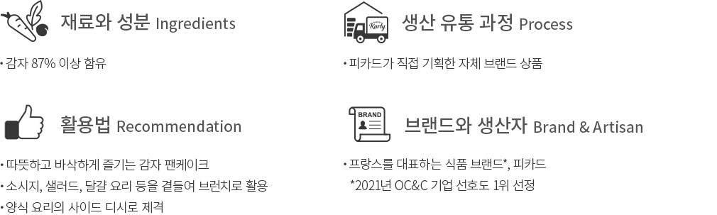 냉동식품에 대한 탁월한 노하우를 가진 프랑스 대표 식품 브랜드, 피카드의 감자 팬케이크를 소개합니다. 신선한 감자를 해바라기씨유에 튀겨낸 다음, 양파 시즈닝을 더해 완성했어요. 오직 3가지 재료만 사용해서 깨끗하게 만들었기에 감자 본연의 담백한 풍미가 오롯이 담겨있답니다. 스테이크 등의 육류 요리를 먹을 때 사이드 디시로 활용하거나 사워크림처럼 산뜻한 소스를 더해 드셔 보세요. 노릇하게 구운 소시지와 샐러드를 더해 브런치로 즐겨도 좋을 거예요.