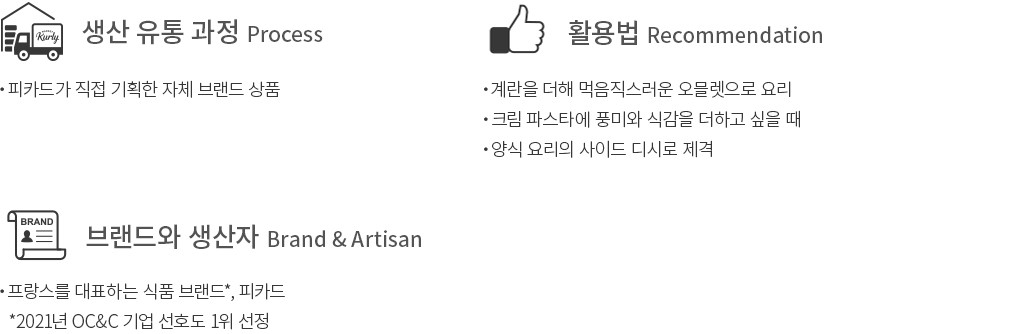 냉동식품에 대한 탁월한 노하우를 가진 프랑스 대표 식품 브랜드, 피카드의 양송이버섯&파슬리를 소개합니다. 양송이버섯과 파슬리, 마늘을 함께 볶은 다음, 약간의 후추를 더해 완성했어요. 담백하면서도 향긋한 풍미와 은은한 감칠맛이 느껴져 스테이크 등의 육류 요리에 곁들이기 좋답니다. 계란을 더해 오믈렛으로 요리하면 간단하면서도 멋스러운 브런치가 금세 완성될 거예요. 취향에 따라 다양한 방법으로 즐겨 보세요.