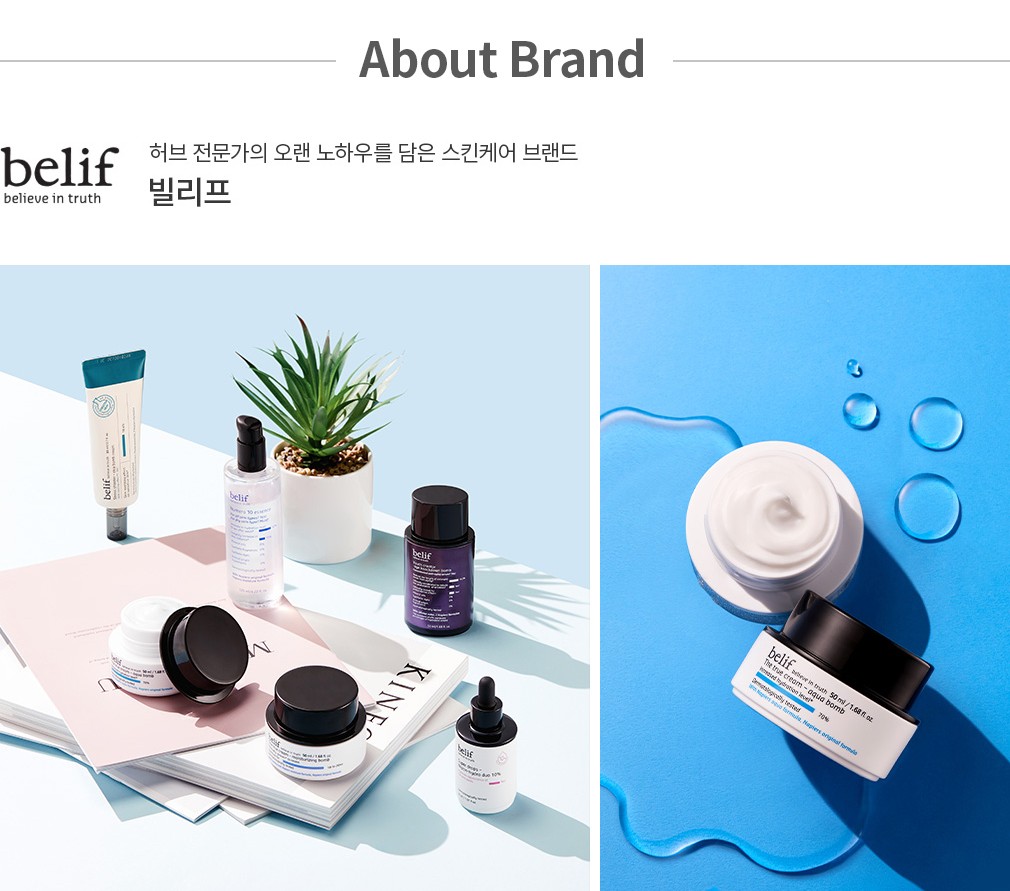 빌리프는 허브 전문가 Duncan Napeirs의 지식과 정신을 이어받아 탄생한 스킨케어 브랜드예요. 전통 조제 기법과 엄선한 원료를 바탕으로 현대인의 피부 고민에 맞는 다양한 제품을 개발하였죠. 이름에서도 알 수 있듯 빌리프(belif)는 믿음과 신뢰를 최우선의 가치로 내세우며 오랜 시간 많은 사랑을 받고 있는데요. 패션, 리빙 등 다양한 브랜드와의 콜라보레이션을 통해 신선하고 재치 있는 제품을 선보이기도 해요.