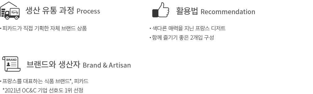 냉동식품에 대한 탁월한 노하우를 가진 프랑스 대표 식품 브랜드, 피카드의 크루스티앙을 만나 보세요. ‘크루스티앙(Croustillant)’은 바삭하다는 뜻을 지닌 프랑스어인데요. 지금 소개하는 크루스티앙 역시 바삭한 식감이 돋보이는 페이스트리 속에 염소치즈와 꿀, 무화과를 가득 채워 넣은 디저트랍니다. 달콤하면서도 짭조름한 맛과 진한 풍미, 다채로운 식감이 어우러져 색다른 매력을 자랑해요. 프랑스 정통 페이스트리를 편안하게 경험하고 싶은 분에게 추천해 드립니다.