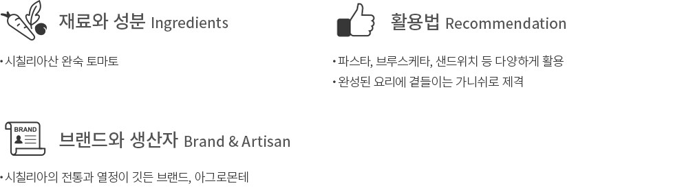 시칠리아의 전통과 열정이 깃든 브랜드, 아그로몬테의 세미드라이 토마토를 소개할게요. 시칠리아산 완숙 토마토를 사용해 풍성한 과육을 자랑하는 제품이에요. 반쯤 말린 토마토를 반으로 잘라 해바라기씨유에 넣고 바질, 오레가노 등을 더해 절였답니다. 쫄깃하면서도 부드러운 식감은 물론, 새콤달콤한 토마토의 풍미를 맛볼 수 있지요. 파스타, 브루스케타 등 다양한 요리에 활용하는 것은 물론, 가니쉬로 곁들여도 좋을 거예요.