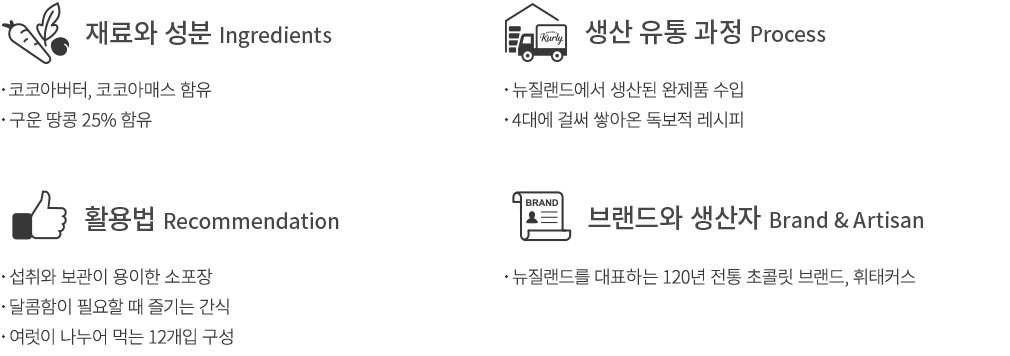 뉴질랜드에서 건너온 120년 전통의 초콜릿 브랜드, 휘태커스를 소개할게요. 엄선한 코코아버터와 코코아매스만을 사용해 카카오 본연의 깊이 있는 풍미가 깃든 초콜릿을 만들고 있지요. 지금 소개하는 미니슬랩 피넛 밀크초콜릿은 부드러운 초콜릿 사이로 구운 땅콩이 콕콕 박혀있는 것이 특징이에요. 땅콩을 한번 구워 넣어 고소함은 배가 되고, 입자감을 살려 다졌기에 톡톡 씹히는 식감이 매력적이랍니다. 하나씩 깔끔하게 포장했으니 아이들 간식은 물론, 외출할 때 하나씩 챙기기에도 좋을 거예요.