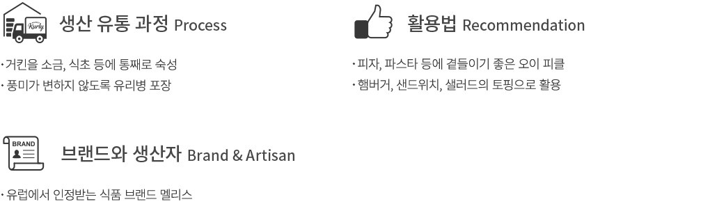 코니숑보다 크기가 큰 거킨(Gherkin)은 이름만 들으면 생소하지만 유럽에서 즐겨 먹는 오이 피클을 가리켜요. 지금 소개하는 멜리스의 제품으로 코니숑의 새콤달콤한 풍미를 경험해 보세요. 작게 썬 오이 피클과 달리, 통째로 소금과 식초에 절여 한 병에 담았답니다. 덕분에 원하는 크기로 슬라이스해 활용하기 좋은데요. 피자, 파스타를 먹을 때 곁들여 즐겨도 좋고요. 잘게 다져 샐러드나 샌드위치의 토핑으로 활용하기에도 제격이랍니다.