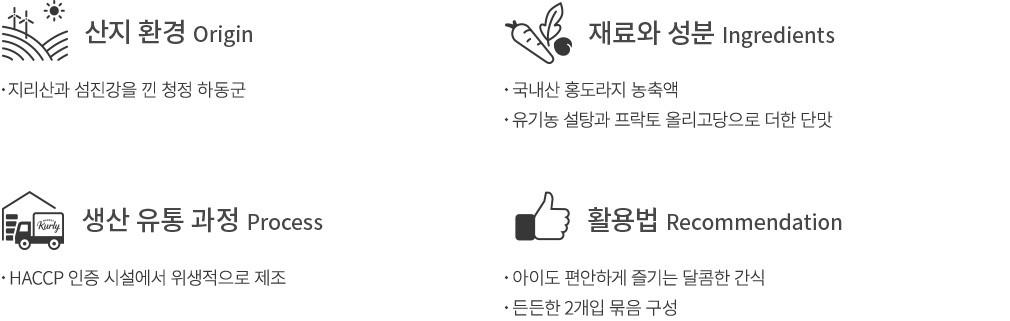 지리산과 섬진강을 끼고 있는 하동군에서 지역 농민과 함께 이유식을 만드는 사회적 기업, 에코맘의산골이유식이 선보이는 산골푸딩을 만나 보세요. 국내산 홍도라지 농축액에 국내산 과일즙을 더하고, 유기농 설탕과 프락토 올리고당으로 단맛을 내어 완성했답니다. 과일 본연의 새콤달콤한 풍미를 그대로 담았지요. 3가지 종류의 산골푸딩을 준비했으니 아이의 입맛에 따라 선택해 보세요. 아이들도 어른들이 느끼는 달콤한 행복을 즐길 수 있을 거예요.
