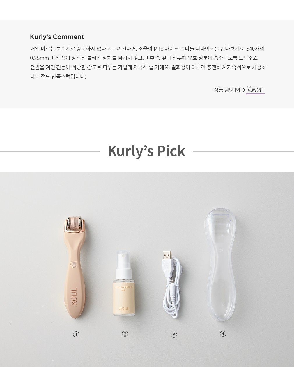 MTS 마이크로 니들 디바이스 ・ 구성 : ①롤러, ②공병, ③USB 케이블, ④전용 케이스