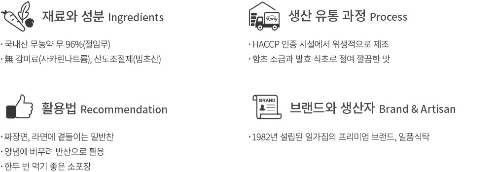 40여 년의 노하우를 담아 만든 일품식탁의 맛단무지를 만나보세요. 국내산 무농약 무를 사용한 것은 물론, 함초 소금과 발효 소금으로 절여 깔끔한 맛이 일품이에요. 한두 번 먹기 좋은 양을 담아 한 팩씩 꺼내 먹기에 제격이랍니다.