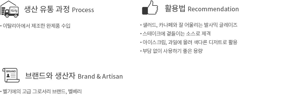 활용팁 ・바닐라 아이스크림에 발사믹 글레이즈를 살짝 뿌려 드셔 보세요. 새콤달콤한 풍미와 부드러운 맛이 어우러져 일상적인 디저트를 색다르게 즐길 수 있을 거예요.