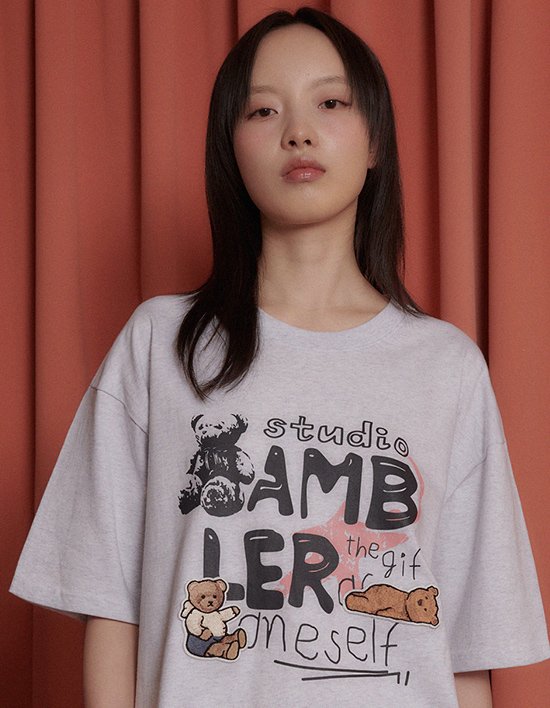 낙서를 한듯 한 레터링들 위로 곰돌이 패치 자수를 올려 키치한 느낌을 주는 입체감 넘치는 반팔 티셔츠
