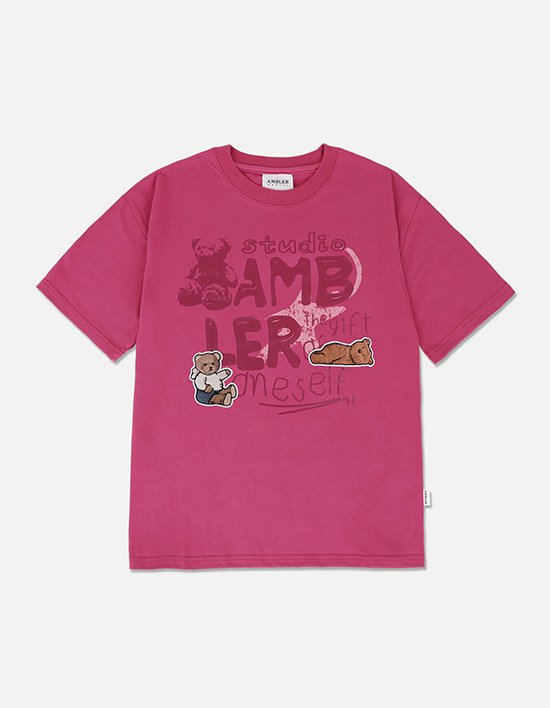 낙서를 한듯 한 레터링들 위로 곰돌이 패치 자수를 올려 키치한 느낌을 주는 입체감 넘치는 반팔 티셔츠