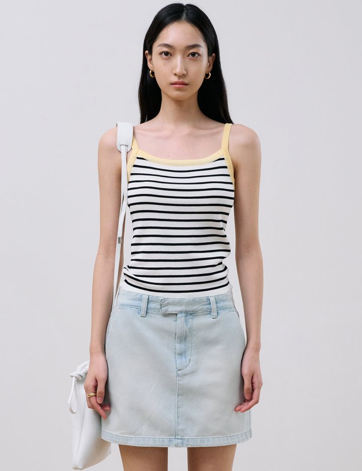 24SS 시즌에 어울리는 컬러 배색과 스트라이프 패턴으로 한층 더 쾌활한 무드가 느껴지는 슬리브리스 제품입니다. 텐셀, 실크 혼방 소재로 피부에 닿는 촉감이 부드러우며 단품 또는 이너웨어로 다양한 활용이 가능합니다.