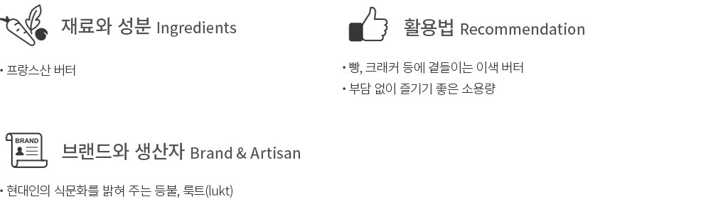 ‘룩트(lukt)’는 아이슬란드어로 등불을 의미합니다. 모든 이의 미식 경험을 환하게 밝히겠다는 의미가 담겨있죠. 이번에는 빵이나 크래커에 곁들이기 좋은 스프레드 버터를 준비했습니다. 프랑스산 버터에 각기 다른 개성을 가진 재료를 더해 색다르게 풀어냈답니다. 4가지 종류 중 취향에 따라 골라보세요.