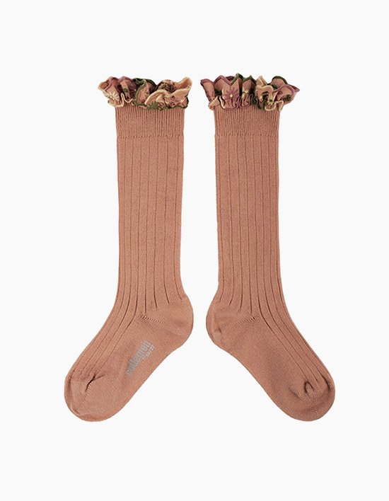 [꼴레지앙] 에그랑틴 플라워 자수 반스타킹 무릎 양말 - 딥로즈