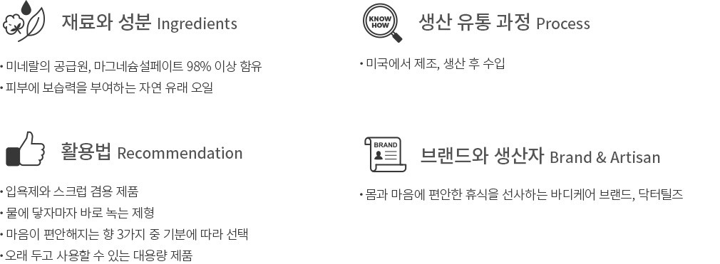 닥터틸즈는 ‘엡섬 솔트'를 주 성분으로 한 바디케어 브랜드예요. 엡섬솔트는 영국의 엡섬 지방에서 발견된 염분 없는 소금인데요. 온천이나 광천수의 주요 미네랄 성분으로도 잘 알려져 있답니다. 지금 소개하는 입욕제는 이 엡섬 솔트를 주원료로 사용해 만들었어요. 식물에서 유래한 에센셜 오일을 블렌딩하여 수분감과 보습력도 알차게 담아냈죠. 오래 두고 쓸 수 있는 대용량 입욕제를, 3가지 향으로 준비했어요. 피부를 탄력 있게 가꿔줌은 물론 깊이 있는 향이 지친 마음에 위로를 전할 거예요.
