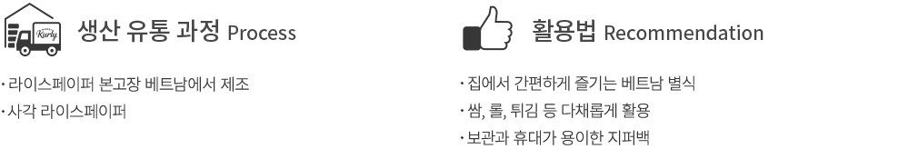 활용팁 ・미지근한 물에 라이스페이퍼를 3~7간 담갔다 꺼낸 후, 충분히 부드러워진 상태에서 사용하세요.