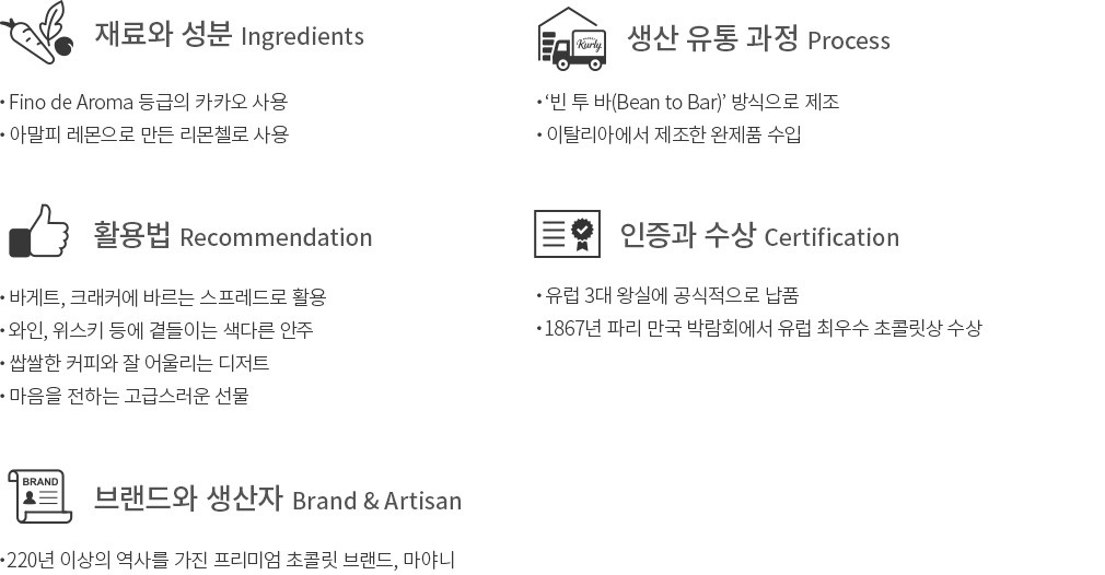 마야니는 1796년에 설립된 이탈리아 최초의 초콜릿 회사입니다. 유럽 3대 왕실에 납품하는 초콜릿답게 로고에는 왕실의 휘장이 그려져 있어요. ‘누구나 쓰는 재료는 마야니가 될 수 없다.’라는 신념 아래, 세계 카카오 협회에서 인증한 Fino de Aroma 등급의 카카오만을 엄선하여 ‘빈 투 바(Bean to Bar)’ 방식으로 만든 초콜릿을 선보인답니다. 최소 30년 이상의 경력을 가진 장인들이 만드는 것은 물론이에요. 새로운 미식 경험을 원한다면 주저 없이 선택해 보세요.