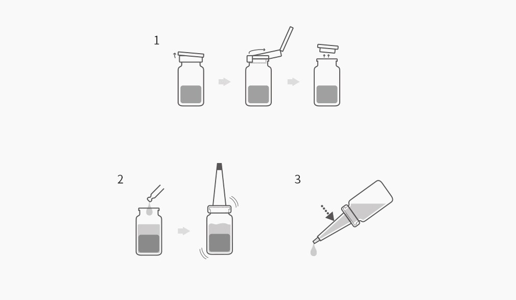 2. 부스터를 스포이드로 덜어 콜라겐 앰플 용기의 눈금선까지 넣고, 고무캡을 끼워주세요.