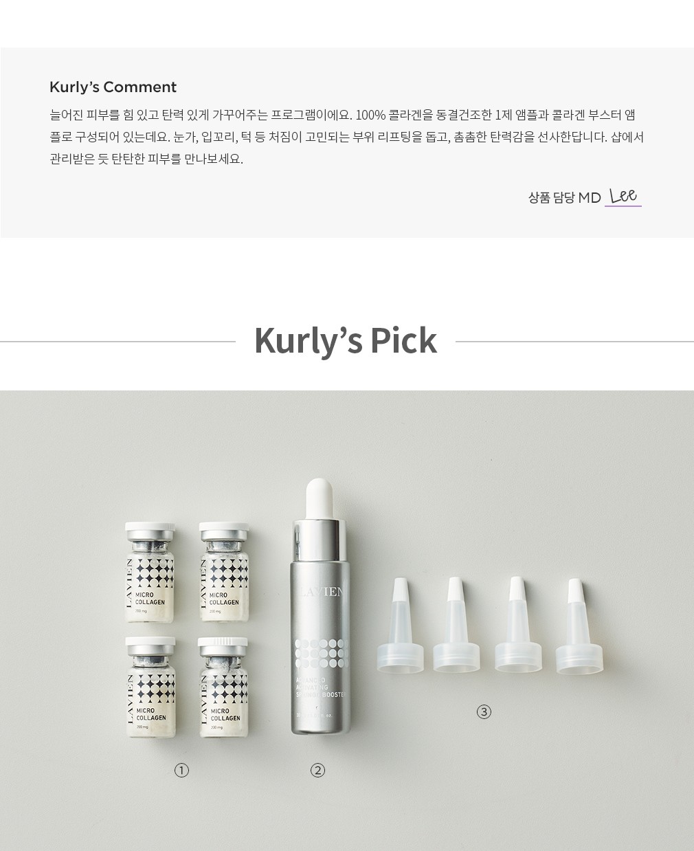 콜라겐 앰플 프로그램 ・ 구성 : ①마이크로 콜라겐, ②어드밴스드 액티베이팅 스핑고 부스터, ③고무캡
