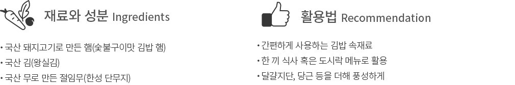 맛살 - 계란, 대두, 밀, 게 함유 김밥햄 - 돼지고기, 쇠고기, 대두, 우유, 밀, 계란, 조개류(굴) 함유