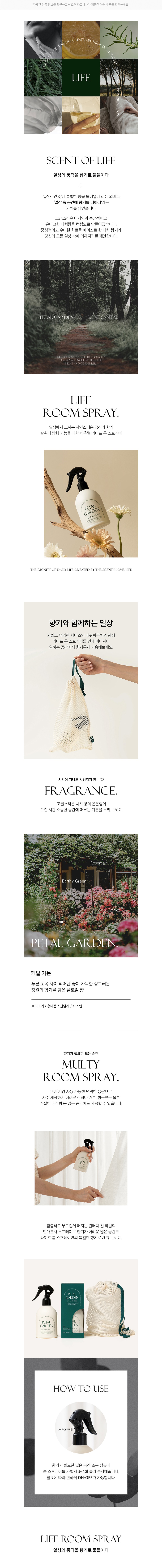 사용법 ・ 향기가 필요한 공간이나 자주 세탁하기 어려운 소파, 커튼, 침구류 등에 3~4회 정도 분사하세요.