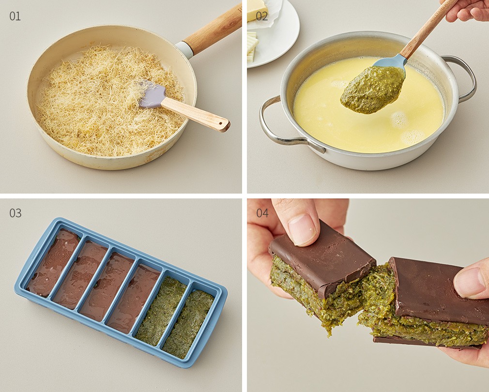 3. 초콜릿 몰드에 중탕으로 녹인 다크 초콜릿을 얇게 깔고 굳혀준 다음, 카다이프 면과 피스타치오 크림을 올리고 다시 초콜릿을 부어 코팅해 주세요.
