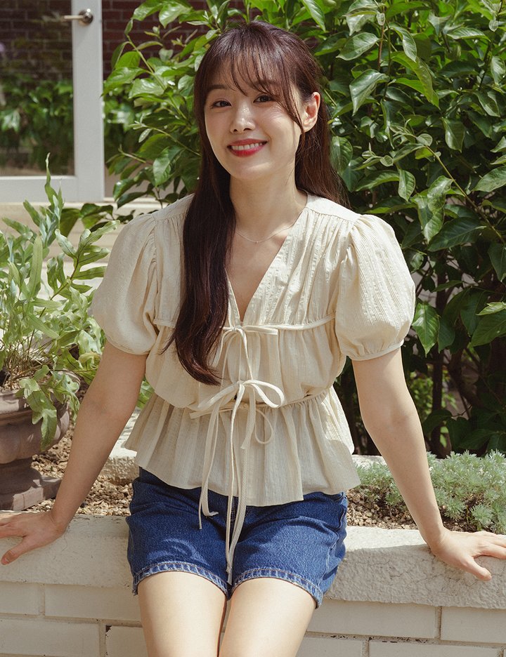 주름 가공된 면 원단을 사용한 블라우스입니다.
