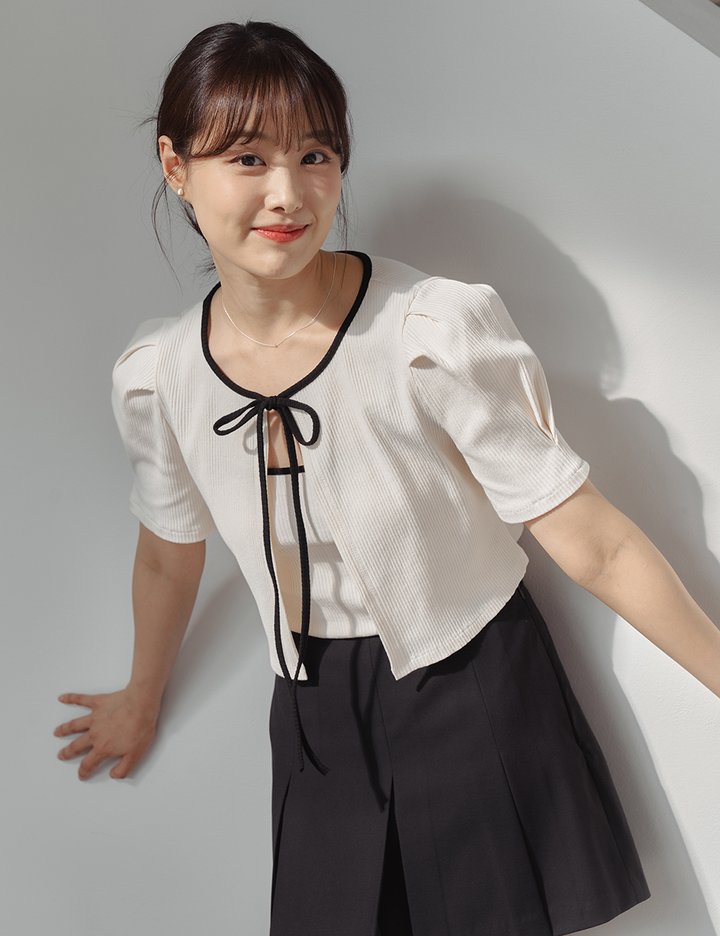 골지 소재를 사용한 슬리브리스 이너와 반팔 가디건 셋업입니다.