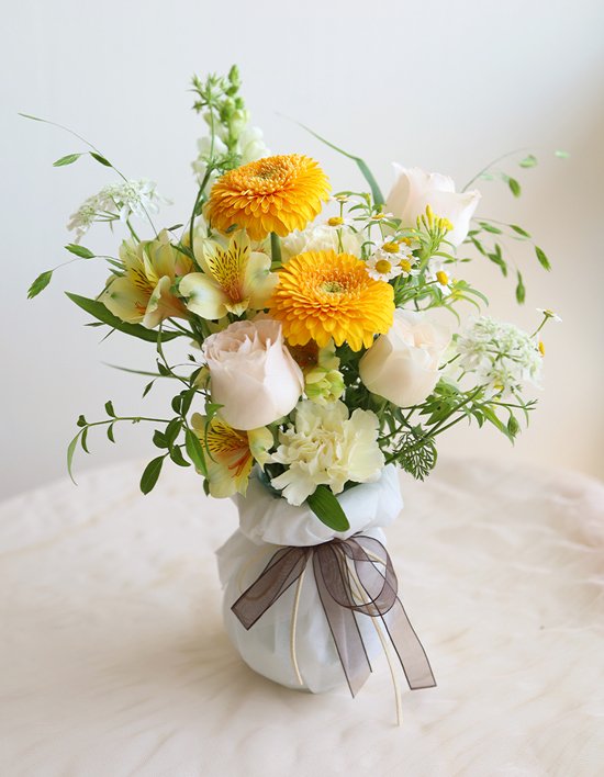 이 계절에 잘 어울리는 싱그러운 색감의 꽃들로 구성해 인테리어&선물용으로 좋은 생화 화병입니다.