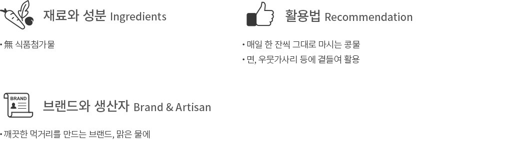 활용법 ・생면, 곤약면 등의 면을 삶아 찬물에 헹군 다음, 콩물을 붓고 오이채를 올려 콩국수를 만들어 보세요. 얼음을 띄우거나 소금, 토마토, 삶은 계란 등을 더해 드시면 더욱 시원하고 맛있답니다.