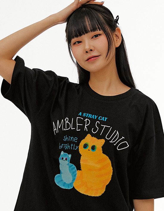 [엠블러] Stray cat 오버핏 반팔 티셔츠 AS1124 블랙 (택1)