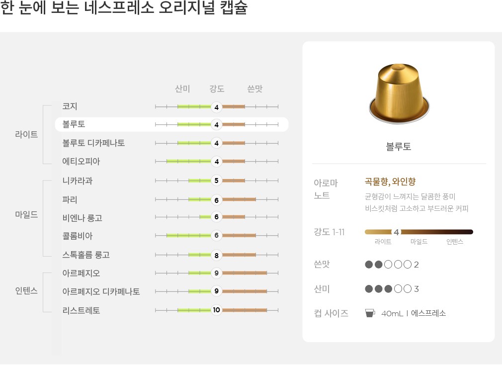 유의사항 ・네스프레소 오리지널 머신으로 추출 가능한 캡슐 커피입니다. 버츄오 머신과는 호환이 불가하니 구입 전 반드시 확인해 주세요.