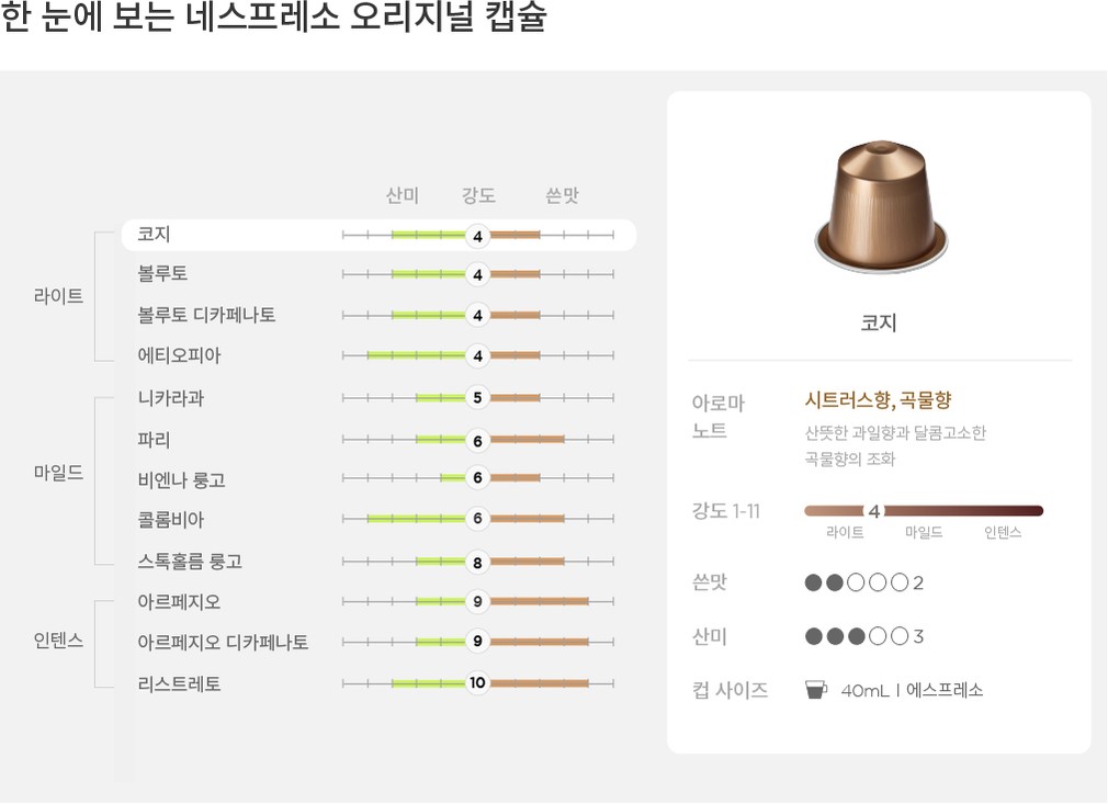 네스프레소 커피가 선사하는 섬세한 아로마를 이제 컬리에서 더 간편하게 누려 보세요. 이번에는 네스프레소가 시작된 순간부터 지금까지 꾸준한 사랑을 받고 있는 에스프레소 캡슐, 코지를 준비했어요. 산뜻하면서도 달콤고소한 풍미에 집중해 보세요.