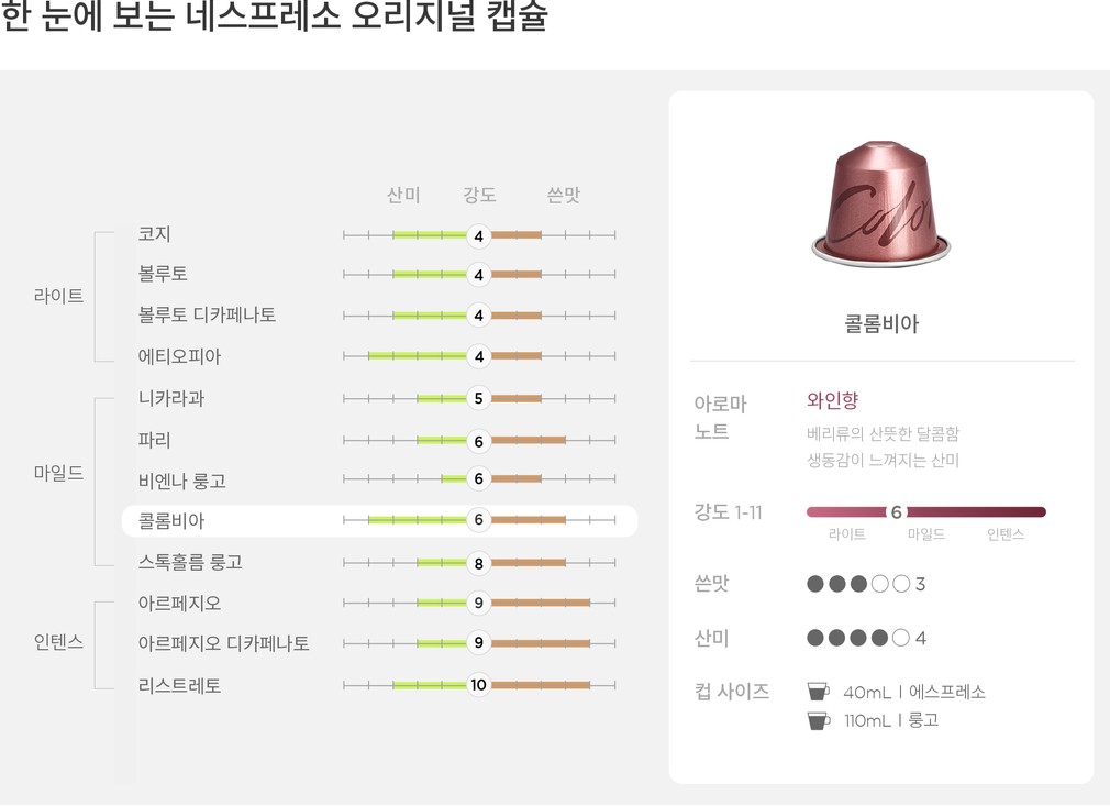 [네스프레소] 콜롬비아 커피 캡슐 10개입(40mL or 110mL)