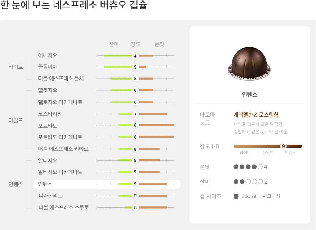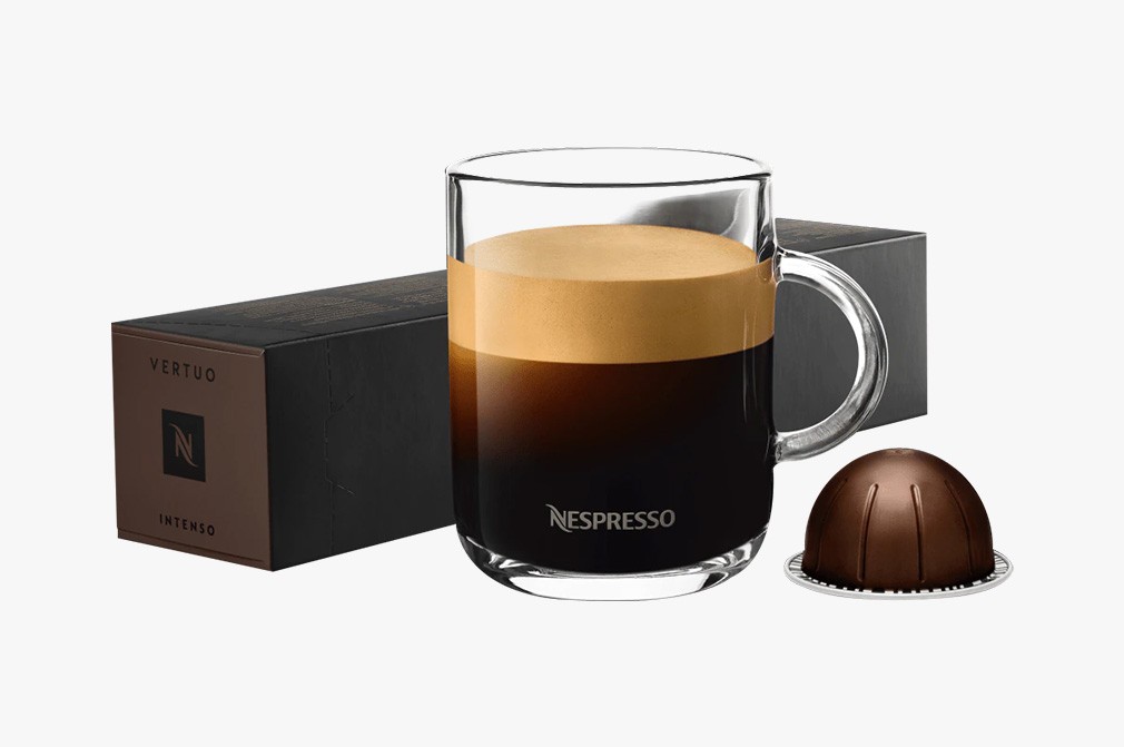 네스프레소 버츄오의 풍성한 크레마가 선사하는 특별한 아로마를 경험해 보세요. 지금 소개하는 인텐소는 진한 로스팅향과 캐러멜향이 입안 가득 여운을 남기는 버츄오 시그니처 캡슐입니다. 블랙커피로 내려 커피 고유의 강렬한 풍미를 즐겨 보세요.