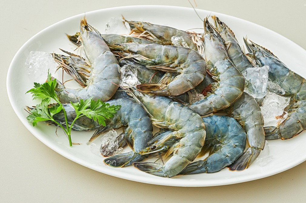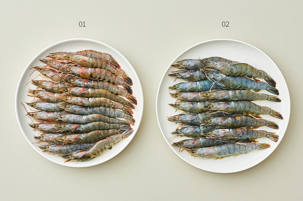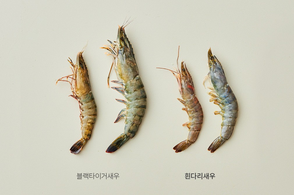 ・① 블랙타이거 새우 : 보리새우과 새우 중에서 가장 큰 사이즈를 자랑해요. 흰다리 새우보다 몸집이 크고 통통한 편이며, 살이 탄탄하고 식감이 쫄깃해요. 속살이 흰다리 새우보다 좀 더 붉은 색을 띠고 있어요.