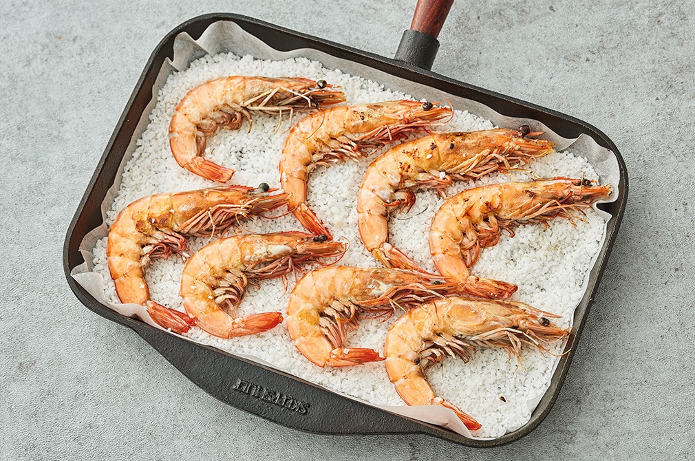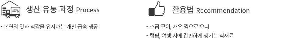 활용팁 ・소금구이 : 호일을 깐 후라이팬에 굵은 소금과 새우를 고르게 올린 후 뚜껑을 덮고 중불에 10분 정도 익혀주세요.