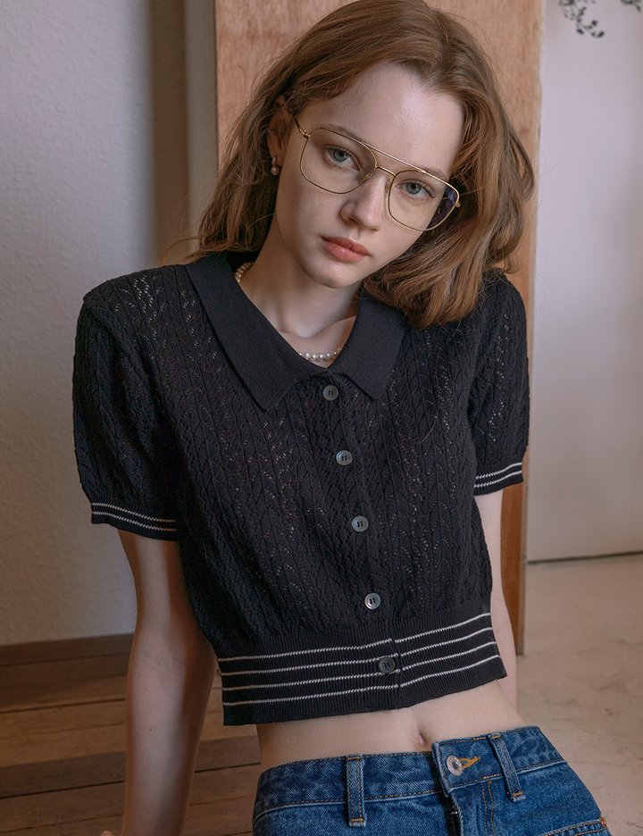 네트(Net) 디테일이 특징인 모던한 무드의 반팔 니트 카디건