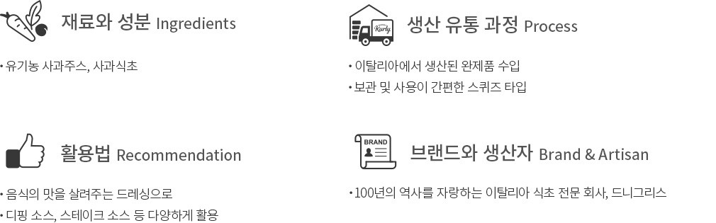 드니그리스는 130년이 넘는 시간 동안 발사믹 식초와 와인 식초를 만들어 온 세계적 명성의 식초 브랜드입니다. 이번에는 글레이즈 타입으로 완성한 애플사이다비니거를 소개할게요. 유기농 사과주스와 사과식초 등을 알맞게 배합해 산뜻한 풍미가 돋보인답니다. 샐러드 드레싱부터 디핑 소스까지 다양하게 활용해 보세요.