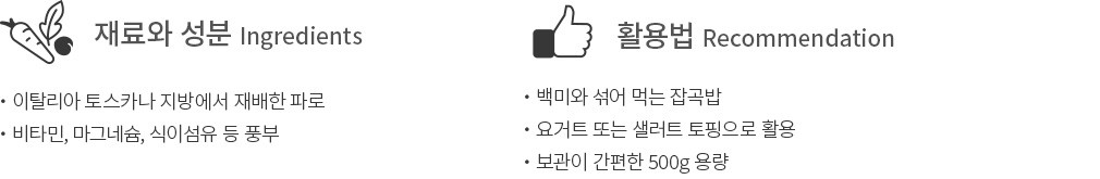 주식으로 즐길 색다른 곡물을 찾고 있다면, 파로를 눈여겨 보세요. 이탈리아 토스카나에서 생산된 파로는 높은 섬유질은 물론 퀴노아보다 낮은 당 함량을 자랑해요. 쌀과 함께 섞어 밥을 짓거나 샐러드 등에 올려 부드러우면서도 톡톡 씹히는 토핑으로 활용해 보세요.