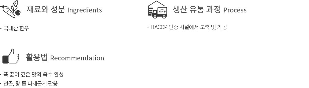뽀얗게 우러난 사골 국물 한 숟갈이면, 몸 속 깊은 곳부터 영양분이 차오르는 기분이 드는데요. 국산 한우의 사골 잡뼈라면 그 건강함이 한층 더할 거예요. 전골이나 탕, 어디에든 두루두루 활용해보세요. 금세 담백하고 깊은 맛의 육수를 내어줄 거예요.