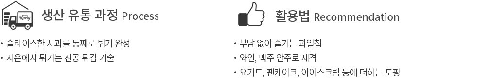 활용팁 ・아이스크림에 애플칩을 토핑처럼 올려 즐겨보세요. 한층 향긋하고 달콤한 풍미를 즐길 수 있답니다.