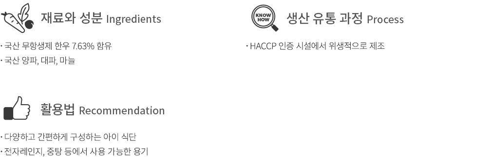 - 쇠고기 함유 * 계란, 우유, 메밀, 땅콩, 대두, 밀, 고등어, 게, 새우, 돼지고기, 복숭아, 토마토, 아황산류, 호두, 닭고기, 쇠고기, 오징어, 조개류(굴, 홍합, 전복 포함) 잣을 사용한 제품과 같은 제조시설에서 제조