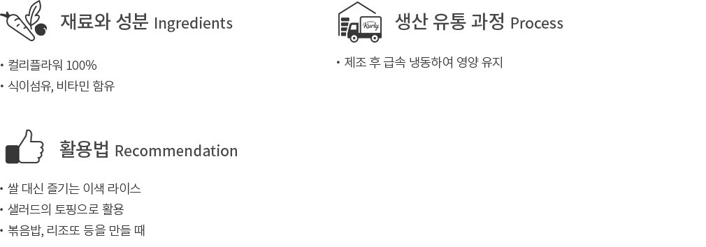 ・샐러드 토핑 : 가볍게 데치거나 전자레인지에 돌려 해동한 후, 샐러드에 가볍게 올려 주세요. 컬리플라워 라이스의 식감이 더해져 더욱 풍성하게 즐길 수 있을 거예요.