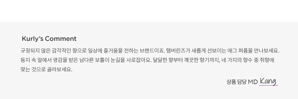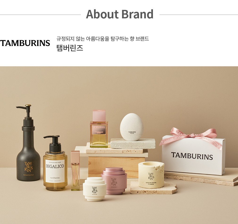 규정되지 않는 아름다움을 탐구하는 향 브랜드, 탬버린즈예요. 세상에 흩어진 모든 이야기에서 영감받아 제품을 선보이지요. 감각적인 향은 단조로운 일상에 자유롭고 새로운 리듬을 부여한답니다. 익숙함을 벗어난 지점에서 찾아낸 탬버린즈만의 향을 느껴보세요.
